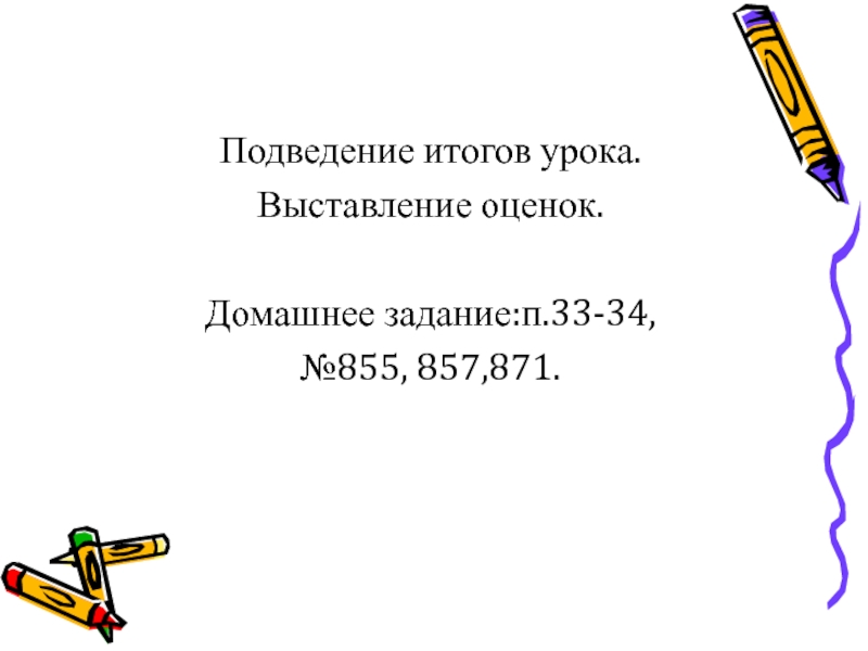 Подведение итогов урока.Выставление оценок.Домашнее задание:п.33-34, №855, 857,871.