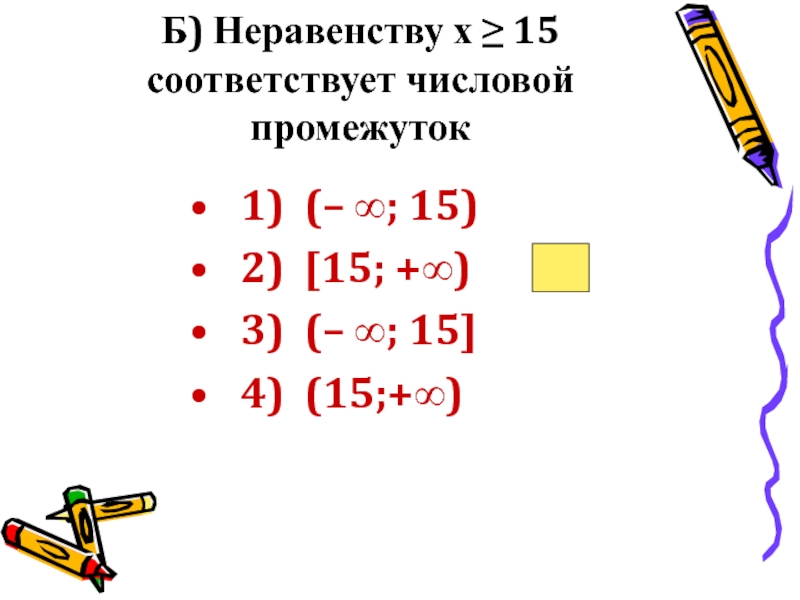 Слайд 15Б) Неравенству х ≥ 15 соответствует числовой промежуток