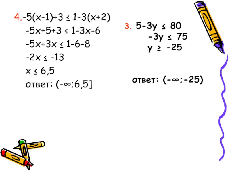 4.-5(x-1)+3 ≤ 1-3(x+2)  -5x+5+3 ≤ 1-3x-6  -5x+3x ≤ 1-6-8  -2x ≤ -13  x