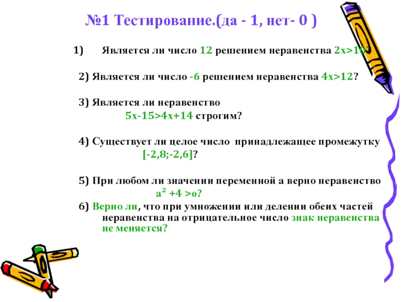 №1 Тестирование.(да - 1, нет- 0 )Является ли число 12 решением неравенства 2х>10?2) Является ли число -6