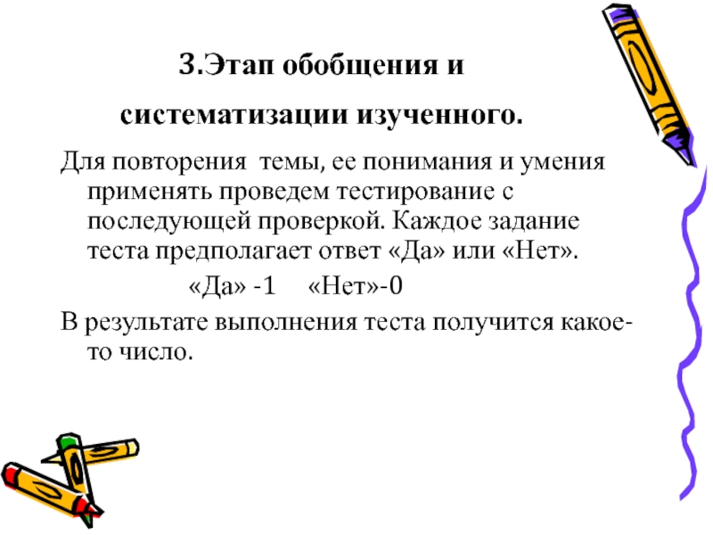 3.Этап обобщения и систематизации изученного. Для повторения темы, ее понимания и умения применять проведем тестирование с последующей