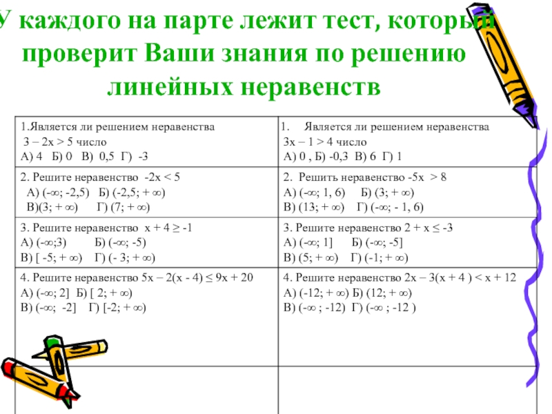 У каждого на парте лежит тест, который проверит Ваши знания по решению линейных неравенств