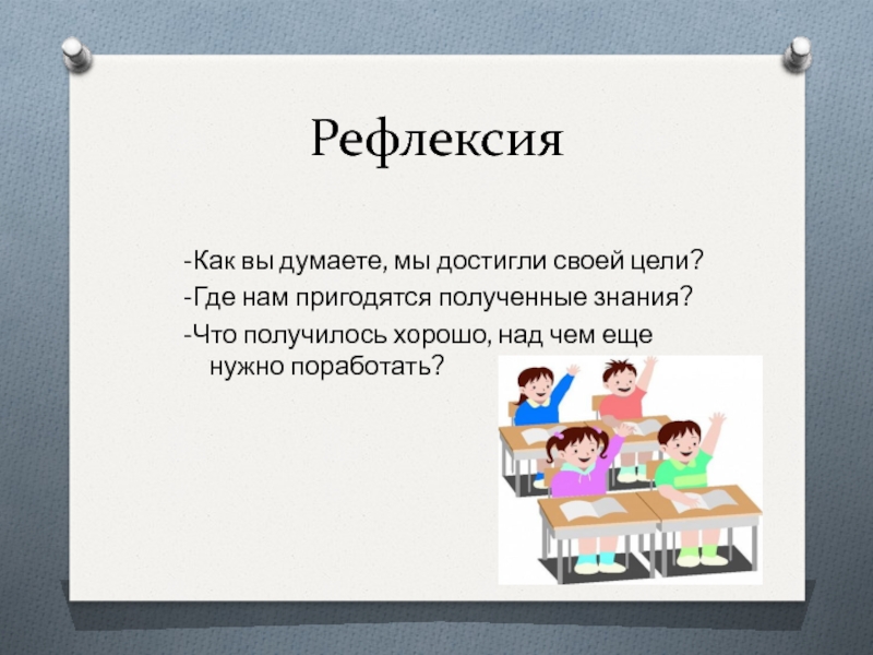 Рефлексия-Как вы думаете, мы достигли своей цели?-Где нам пригодятся полученные знания?-Что получилось хорошо, над чем еще нужно