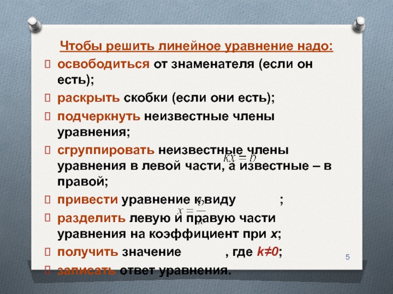 Чтобы решить линейное уравнение надо:освободиться от знаменателя (если он есть);раскрыть скобки (если они есть);подчеркнуть неизвестные члены уравнения;сгруппировать