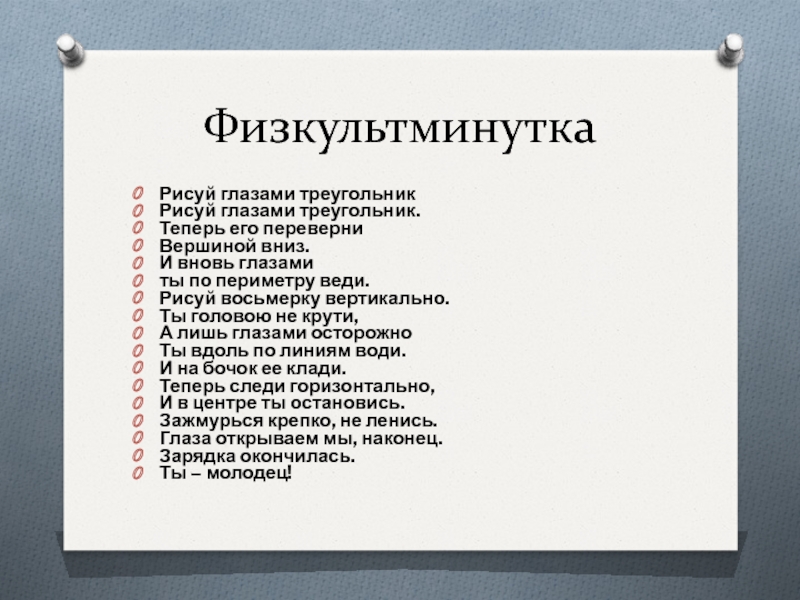 ФизкультминуткаРисуй глазами треугольникРисуй глазами треугольник.Теперь его переверниВершиной вниз.И вновь глазамиты по периметру веди.Рисуй восьмерку вертикально.Ты головою не
