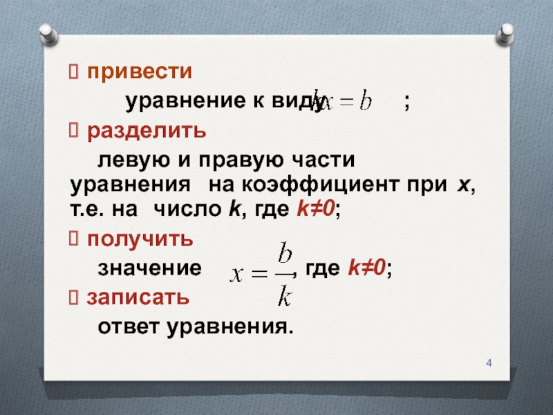части уравнения на коэффициент при x, т.е. на число k, где k≠0;