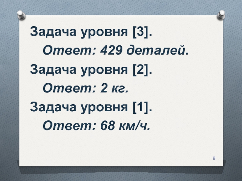 Задача уровня [3].	Ответ: 429 деталей.Задача уровня [2].	Ответ: 2 кг.Задача уровня [1].	Ответ: 68 км/ч.