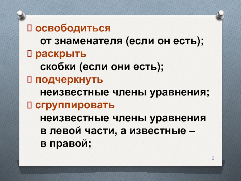 освободиться 	от знаменателя (если он есть);раскрыть	скобки (если они есть);подчеркнуть	неизвестные члены уравнения;сгруппировать	неизвестные члены уравнения 	в левой части, а