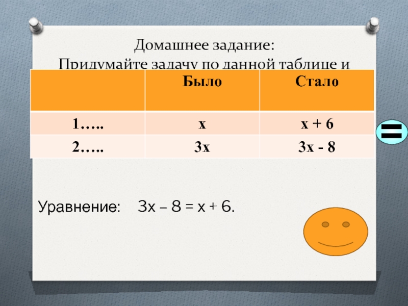 Домашнее задание: Придумайте задачу по данной таблице и решите ее:Уравнение:   3х – 8 = х
