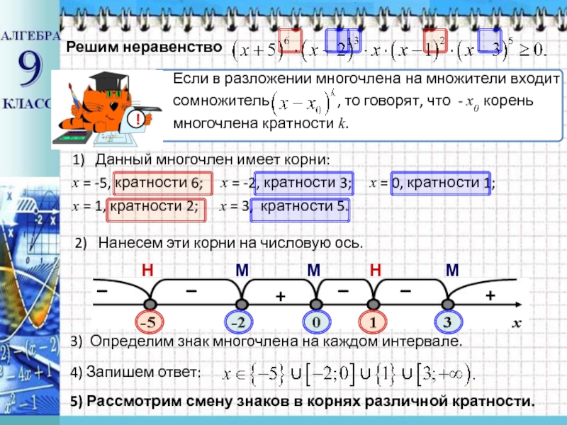 3) Определим знак многочлена на каждом интервале.