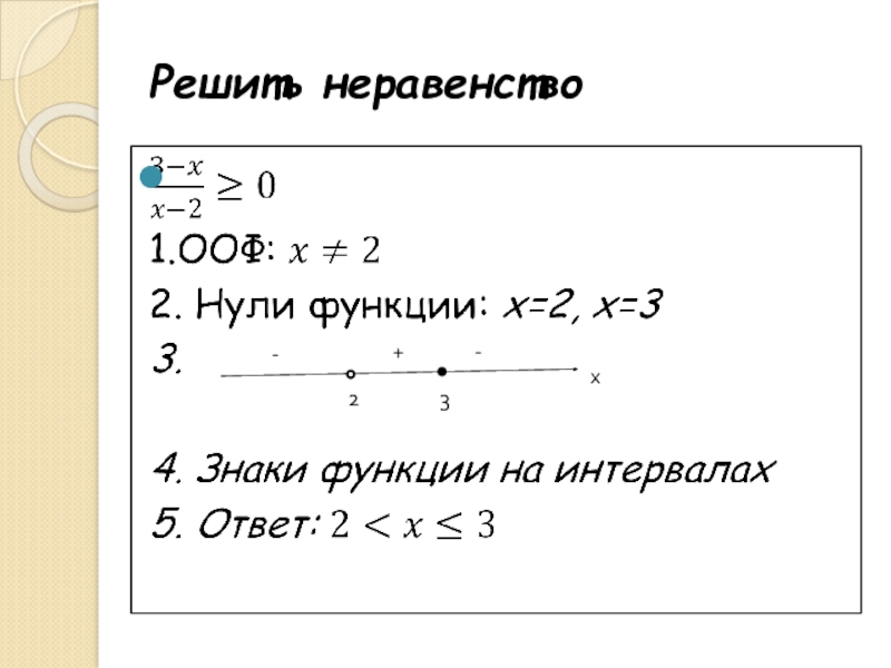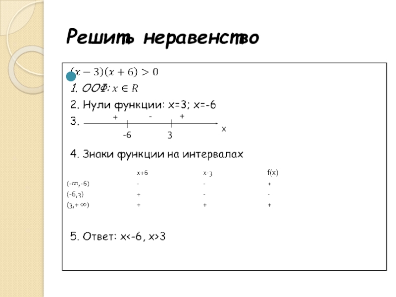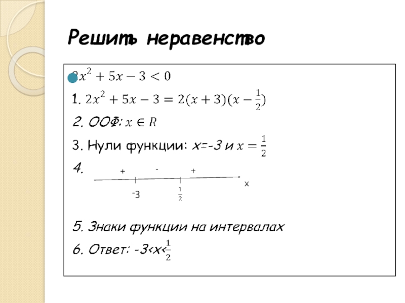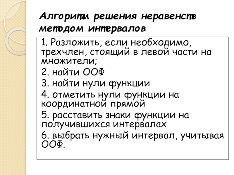 Алгоритм решения неравенств методом интервалов1. Разложить, если необходимо, трехчлен, стоящий в левой части на множители;2. найти ООФ3.