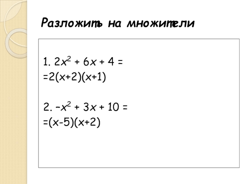 Разложить на множители1. 2х2 + 6х + 4 ==2(х+2)(х+1)2. –х2 + 3х + 10 ==(х-5)(х+2)