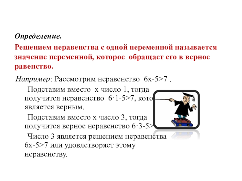 Число 3 является решением неравенства 6х-5>7 или удовлетворяет этому неравенству.