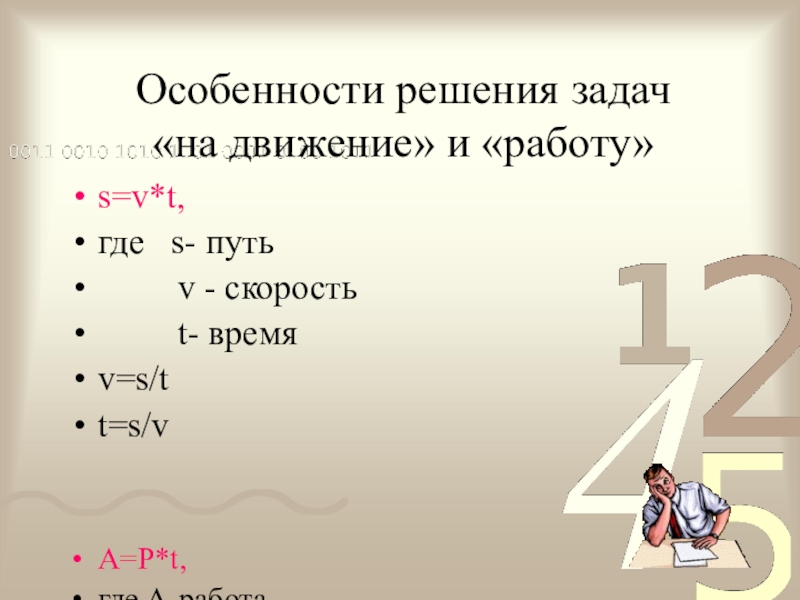 Особенности решения задач  «на движение» и «работу»s=v*t, где  s- путь     v