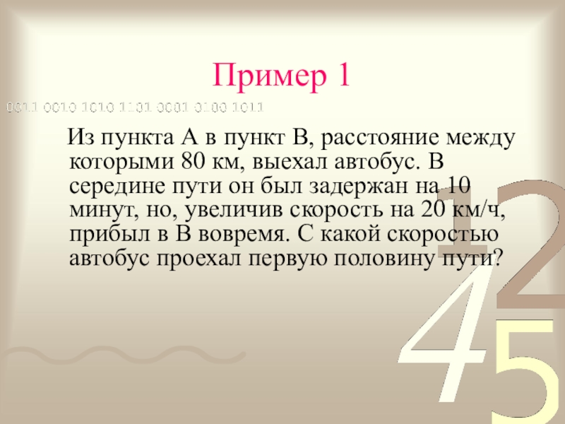 Пример 1  Из пункта А в пункт В, расстояние между которыми 80 км, выехал автобус. В