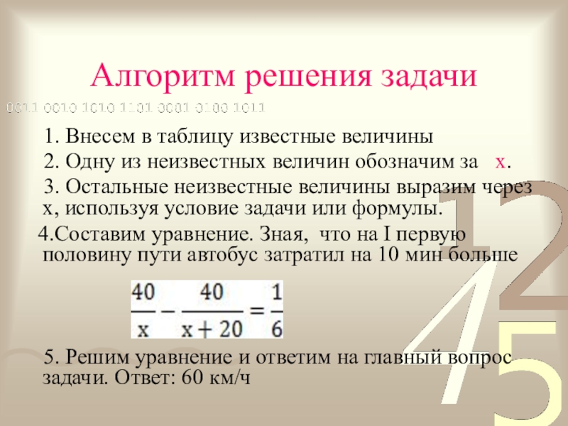 Алгоритм решения задачи  1. Внесем в таблицу известные величины  2. Одну из неизвестных величин обозначим