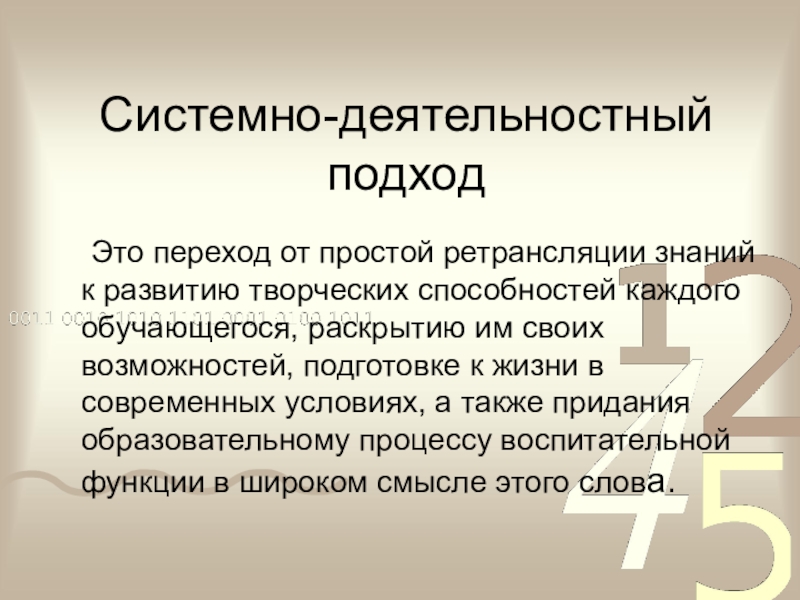 Cистемно-деятельностный подход Это переход от простой ретрансляции знаний к развитию творческих способностей каждого обучающегося, раскрытию им своих возможностей, подготовке к жизни в современных условиях, а также придания образовательному процессу воспитательной функции в широком смысле этого слова.