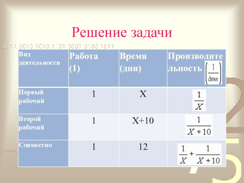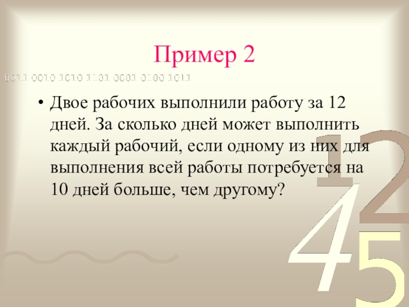 Пример 2Двое рабочих выполнили работу за 12 дней. За сколько дней может выполнить каждый рабочий, если одному