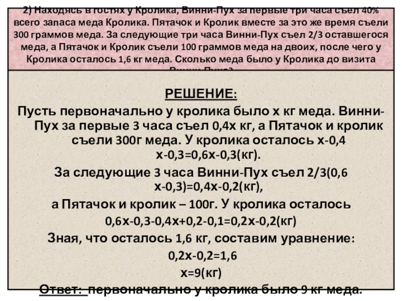 Пусть первоначально у кролика было х кг меда. Винни-Пух за первые 3 часа съел 0,4х кг, а Пятачок и кролик съели 300г меда. У кролика осталось х-0,4х-0,3=0,6х-0,3(кг).