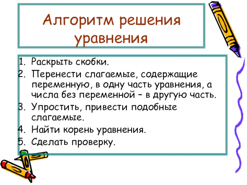 Алгоритм решения уравненияРаскрыть скобки.Перенести слагаемые, содержащие переменную, в одну часть уравнения, а числа без переменной – в