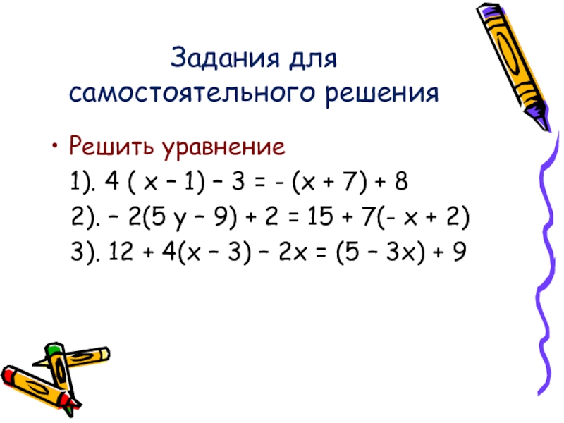 Задания для самостоятельного решенияРешить уравнение  1). 4 ( х – 1) – 3 =