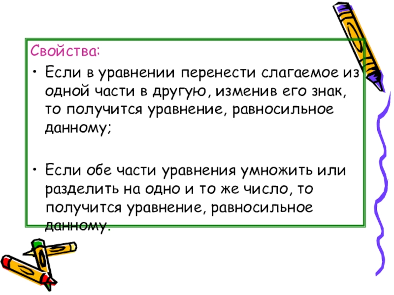 Свойства:     Если в уравнении перенести слагаемое из одной части в другую, изменив его