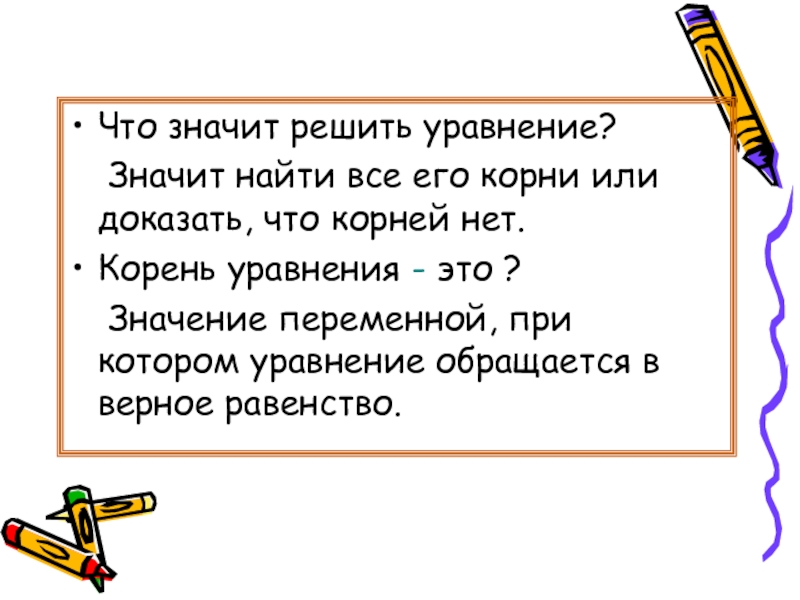 Что значит решить уравнение?	Значит найти все его корни или доказать, что корней нет.Корень уравнения - это ?	Значение