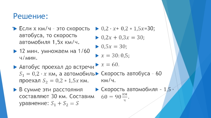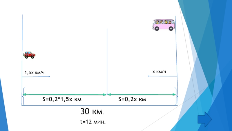 30 км.t=12 мин.S=0,2*1,5х кмS=0,2х км1,5х км/чх км/ч