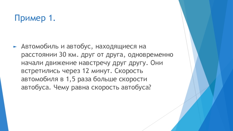Пример 1.Автомобиль и автобус, находящиеся на расстоянии 30 км. друг от друга, одновременно начали движение навстречу друг другу. Они встретились через 12 минут. Скорость автомобиля в 1,5 раза больше скорости автобуса. Чему равна скорость автобуса?