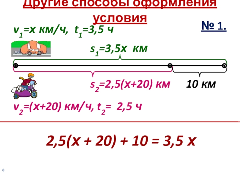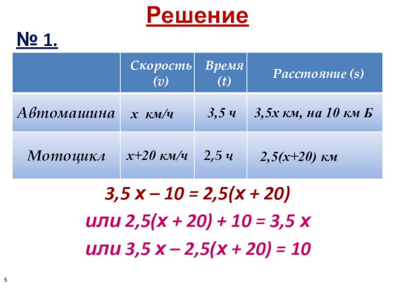Автомашина за 3,5 ч проехала на 10 км больше, чем мотоцикл за 2,5 ч. Скорость мотоцикла на 20 км/ч больше, чем скорость автомашины. Найдите скорость автомашины и скорость мотоцикла.