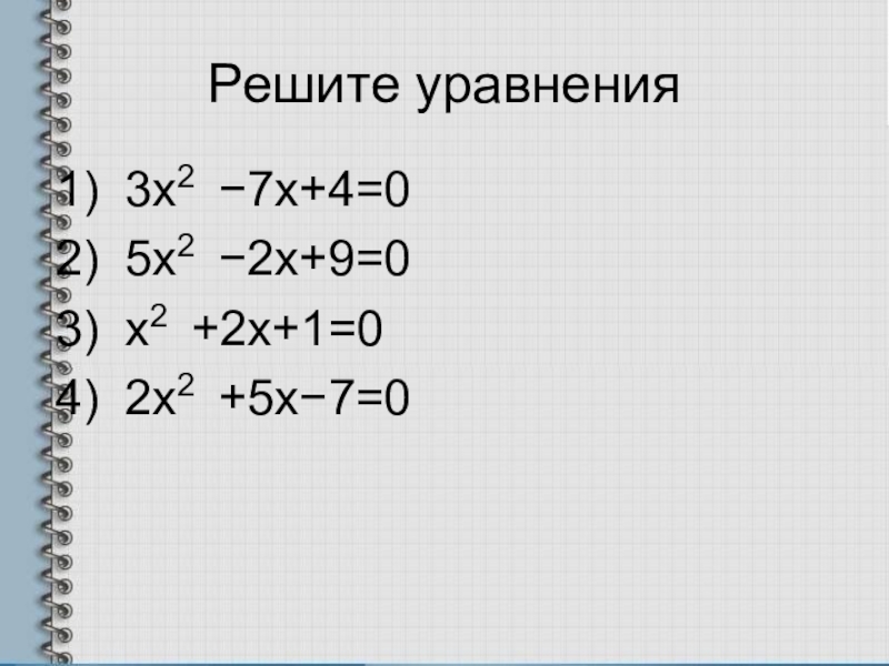 Решите уравнения3х2 −7х+4=05х2 −2х+9=0х2 +2х+1=02х2 +5х−7=0