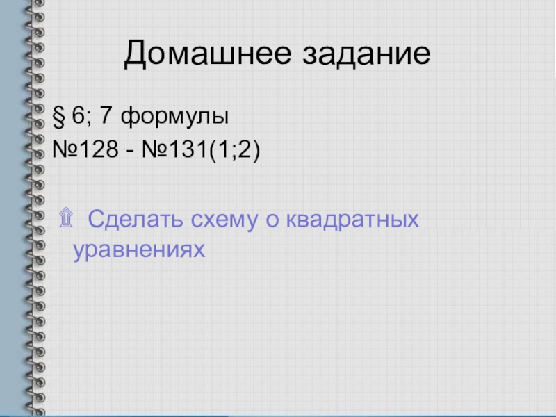 Домашнее задание§ 6; 7 формулы№128 - №131(1;2) ۩ Сделать схему о квадратных уравнениях