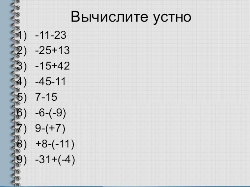 Вычислите устно-11-23-25+13-15+42-45-117-15-6-(-9)9-(+7)+8-(-11)-31+(-4)