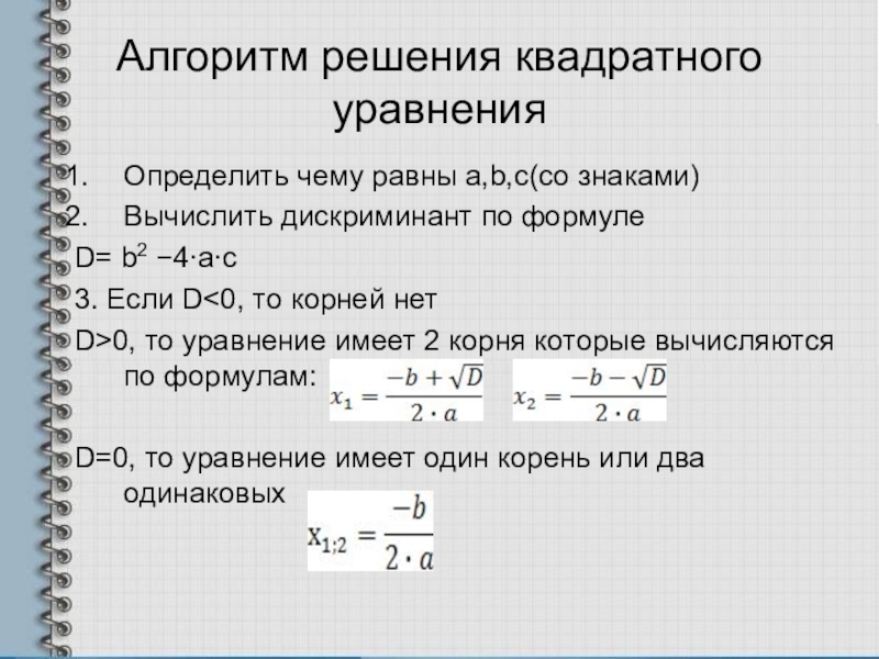 Алгоритм решения квадратного уравненияОпределить чему равны а,b,с(со знаками) Вычислить дискриминант по формулеD= b2 −4∙а∙с3. Если D0, то