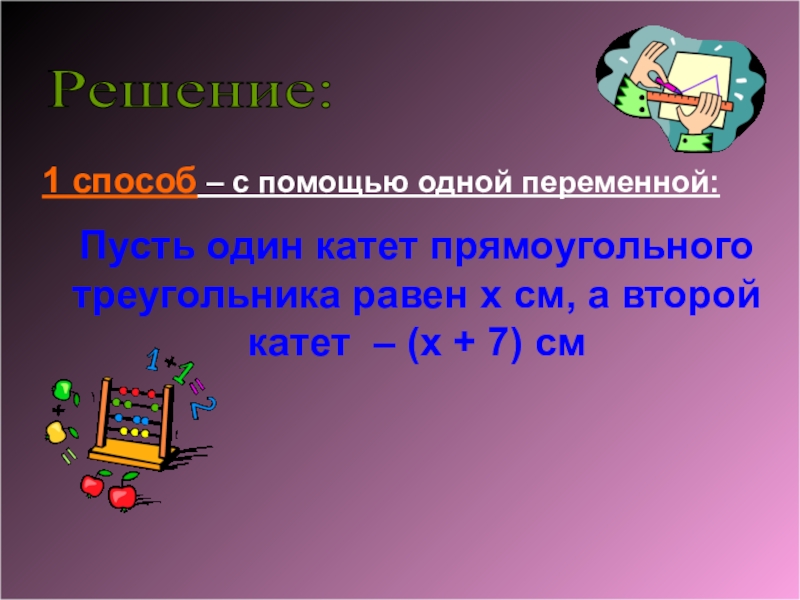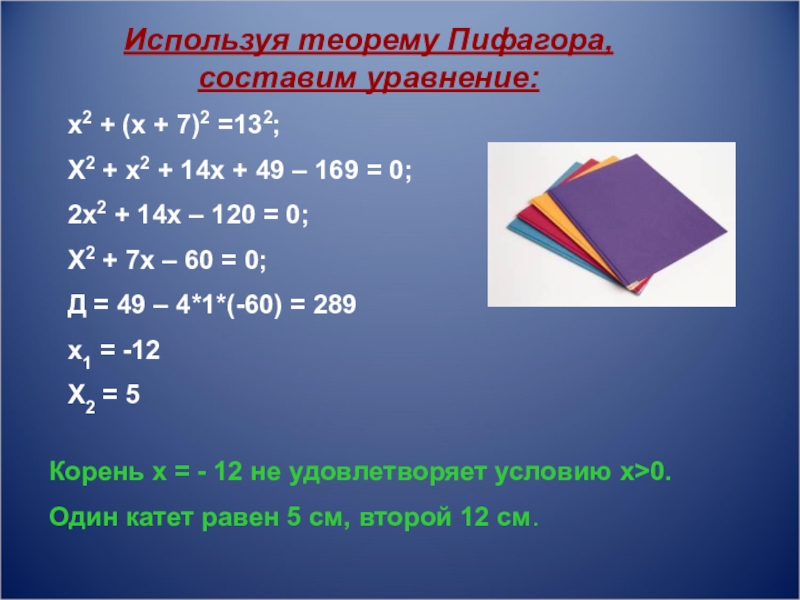 «Гипотенуза прямоугольного треугольника равна 13см. Найдите его катеты, если известно, что один из них на 7см больше другого.»
