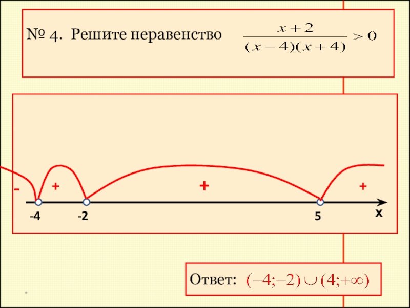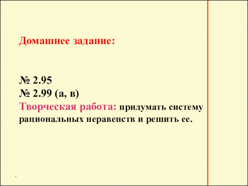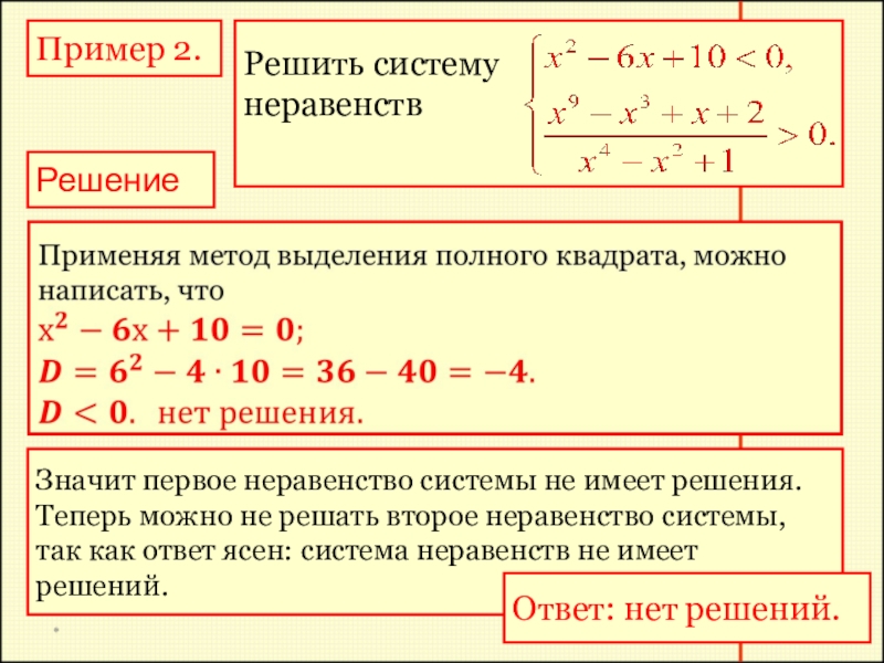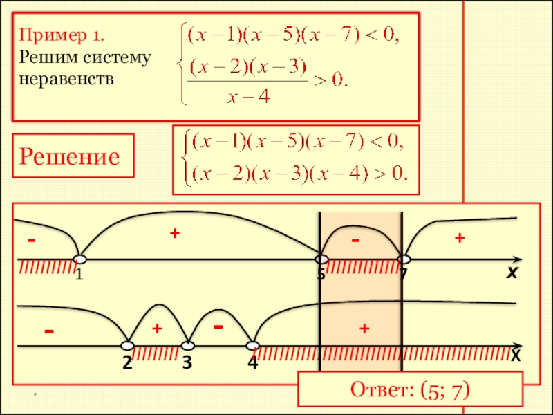 Для того чтобы решить систему рациональных неравенств, надо решить каждое неравенство системы, затем найти общую часть (пересечение) полученных множеств решений – она и будет множеством всех решений системы.