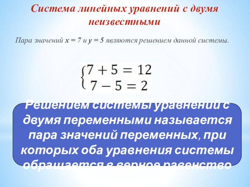 Решением системы уравнений с двумя переменными называется пара значений переменных, при которых оба уравнения системы обращается в верное равенство