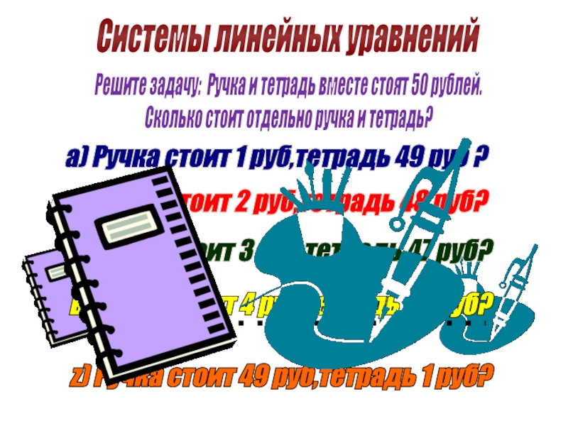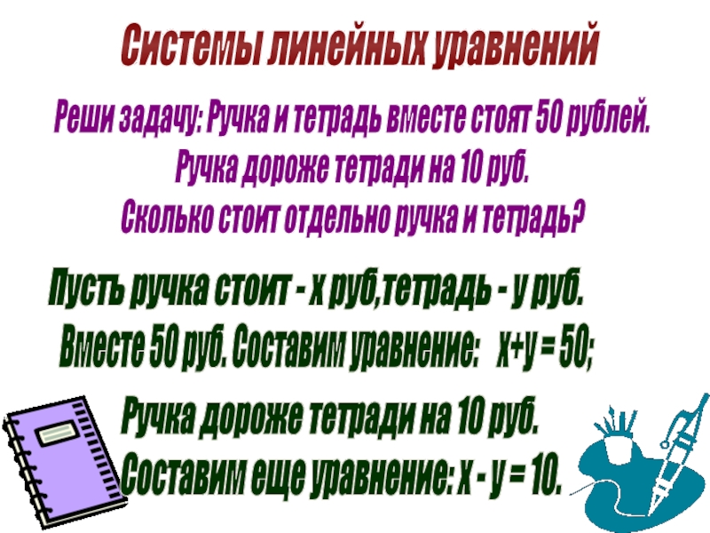 Решите задачу: Ручка и тетрадь вместе стоят 50 рублей.