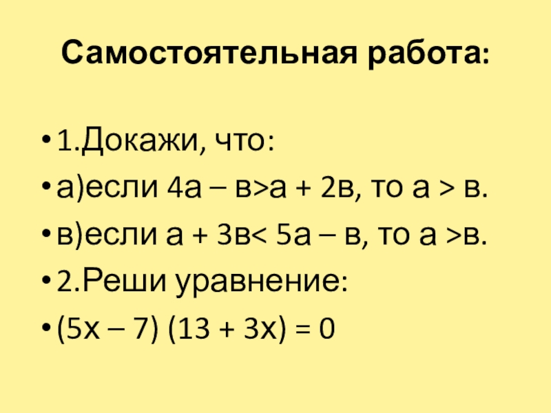 Самостоятельная работа:1.Докажи, что:а)если 4а – в>а + 2в, то а > в.в)если а + 3в< 5а – в, то а >в.2.Реши уравнение:(5х – 7) (13 + 3х) = 0