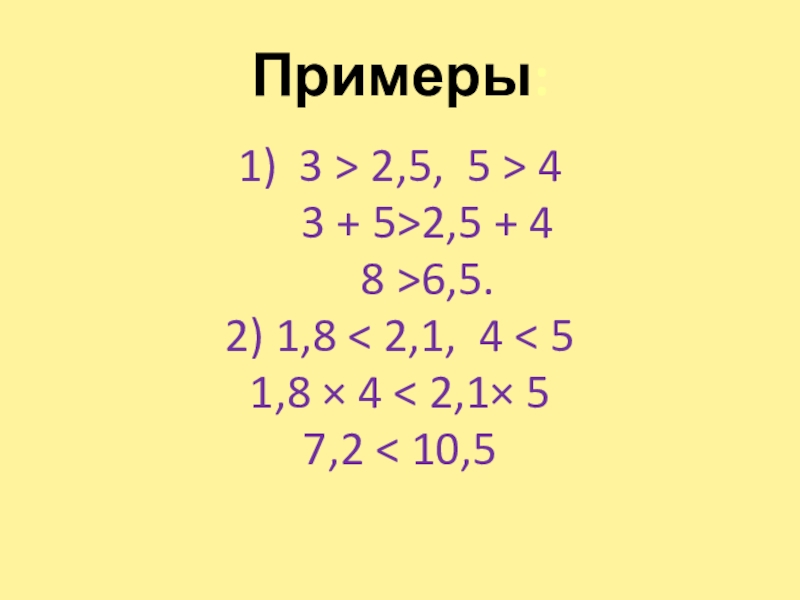 Примеры:1) 3 > 2,5, 5 > 4   3 + 5>2,5 + 4   8