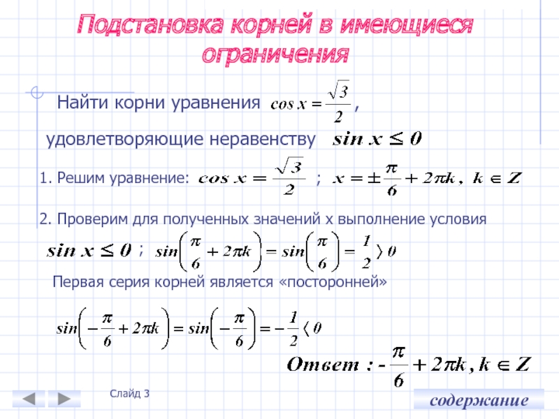 2. Подставим корни уравнения в имеющиеся ограничения и решим уравнение на заданном промежутке: