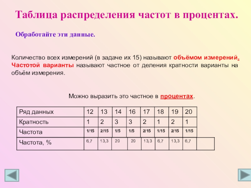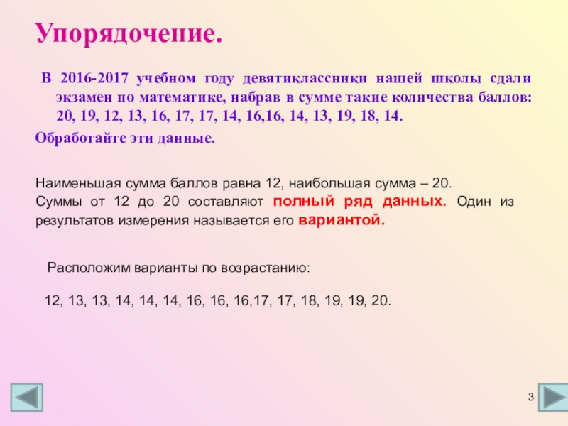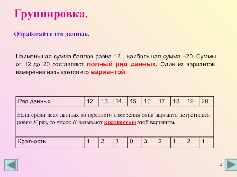 Суммы от 12 до 20 составляют полный ряд данных. Один из результатов измерения называется его вариантой.