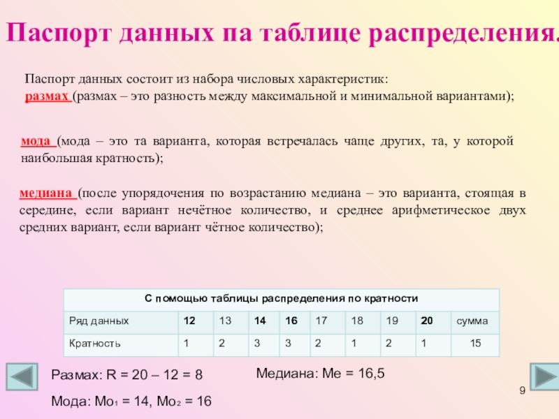 медиана (после упорядочения по возрастанию медиана – это варианта, стоящая в середине, если вариант нечётное количество, и среднее арифметическое двух средних вариант, если вариант чётное количество);