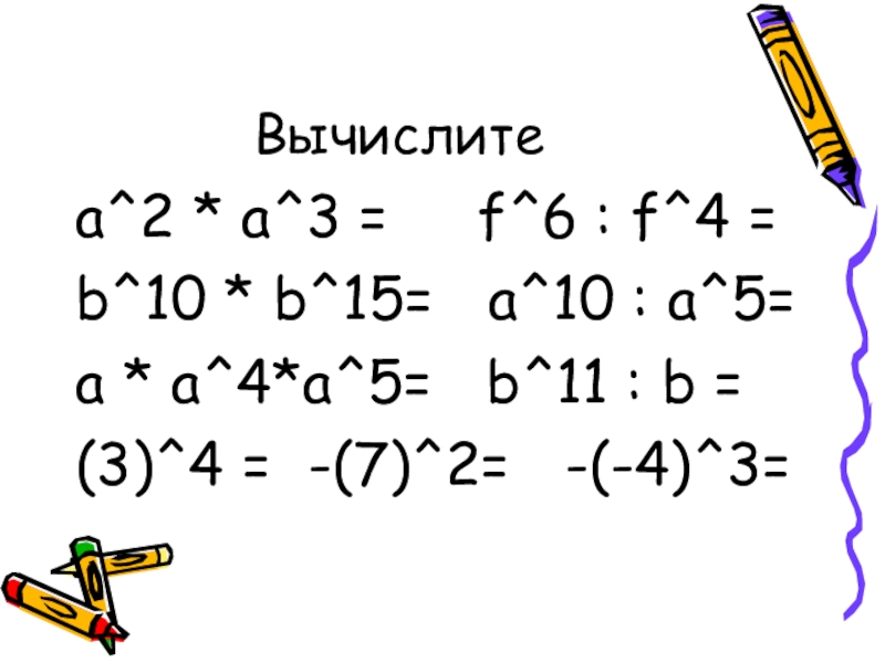 Вычислитеа^2 * a^3 =   f^6 : f^4 =b^10 * b^15=  a^10 : a^5=a *