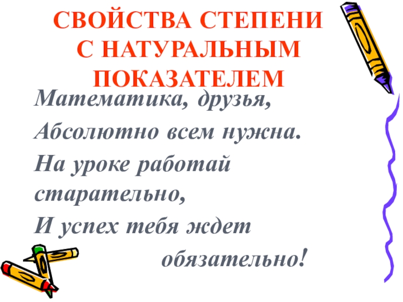СВОЙСТВА СТЕПЕНИ С НАТУРАЛЬНЫМ ПОКАЗАТЕЛЕММатематика, друзья,Абсолютно