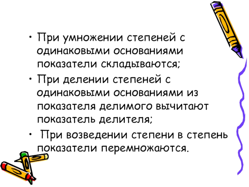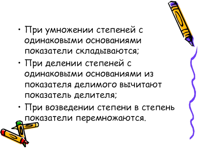 При умножении степеней с одинаковыми основаниями показатели складываются;При делении степеней с одинаковыми основаниями из показателя делимого вычитают