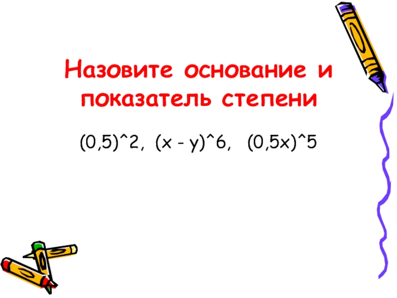 Назовите основание и показатель степени(0,5)^2, (х - у)^6,  (0,5х)^5