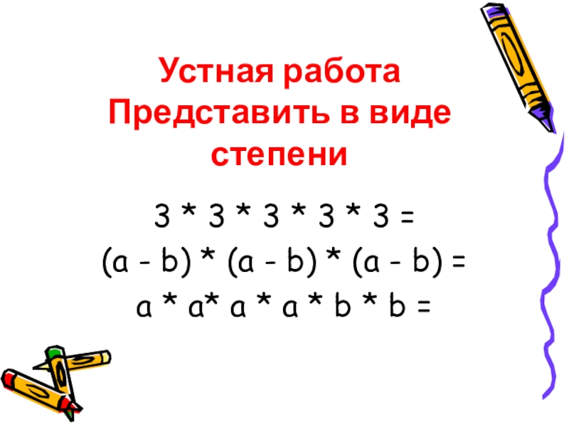 Устная работа Представить в виде степени3 * 3 * 3 * 3 * 3 =(a - b) * (a - b) * (a - b) =а * а* а * а * b * b =