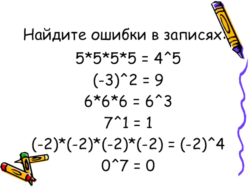Найдите ошибки в записях:5*5*5*5 = 4^5(-3)^2 = 96*6*6 = 6^37^1 = 1(-2)*(-2)*(-2)*(-2) = (-2)^40^7 = 0