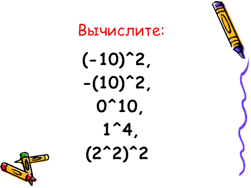 Вычислите:(-10)^2, -(10)^2, 0^10, 1^4, (2^2)^2